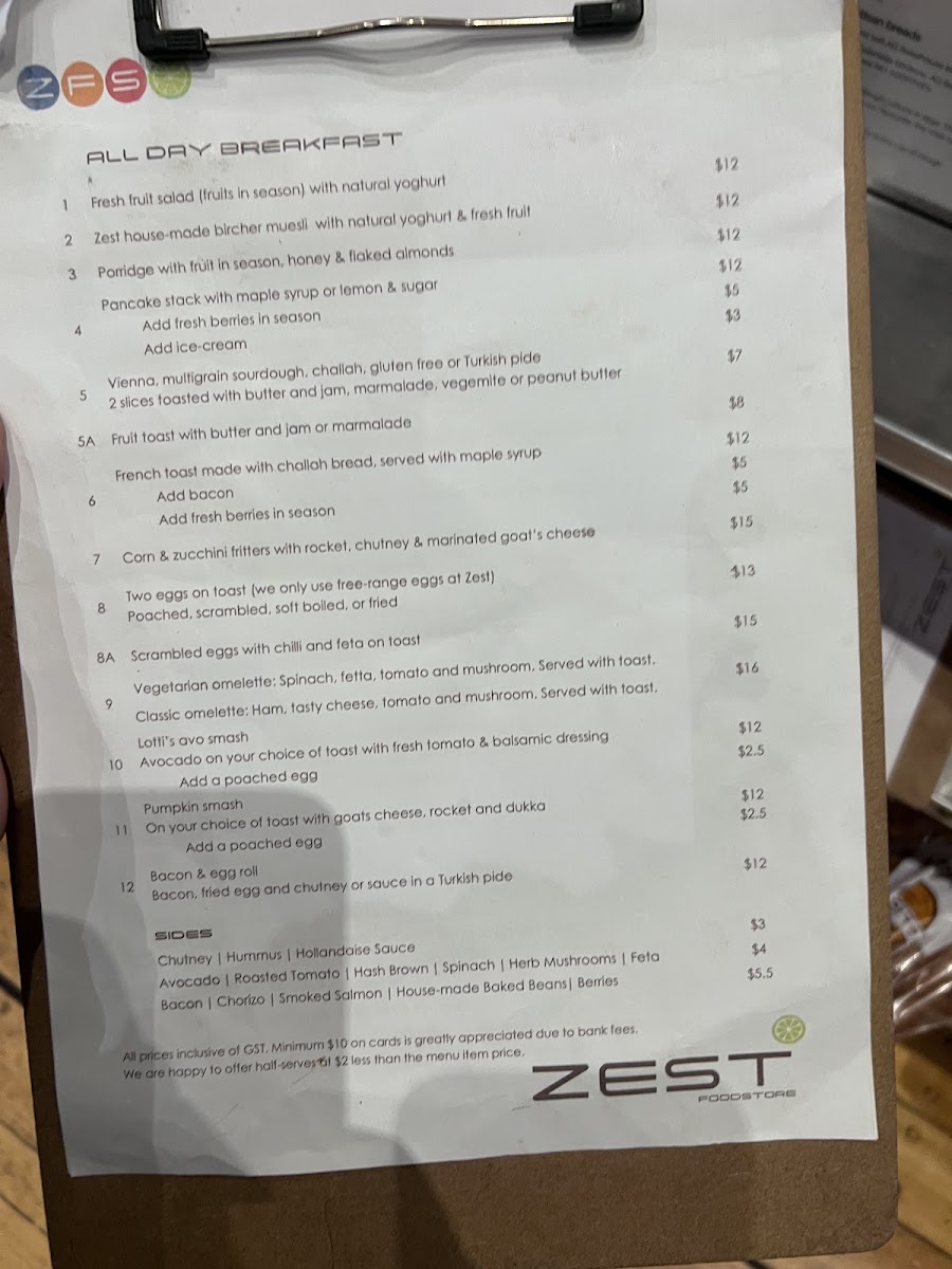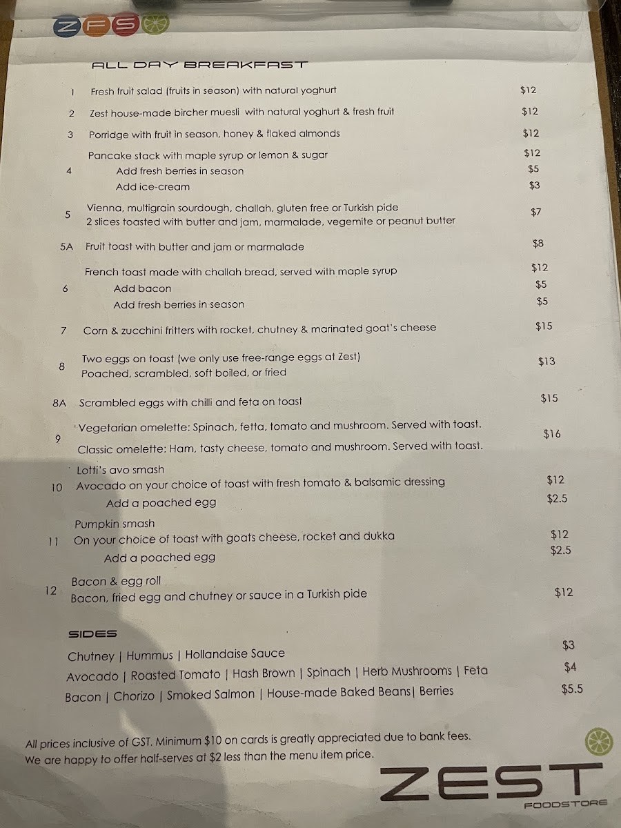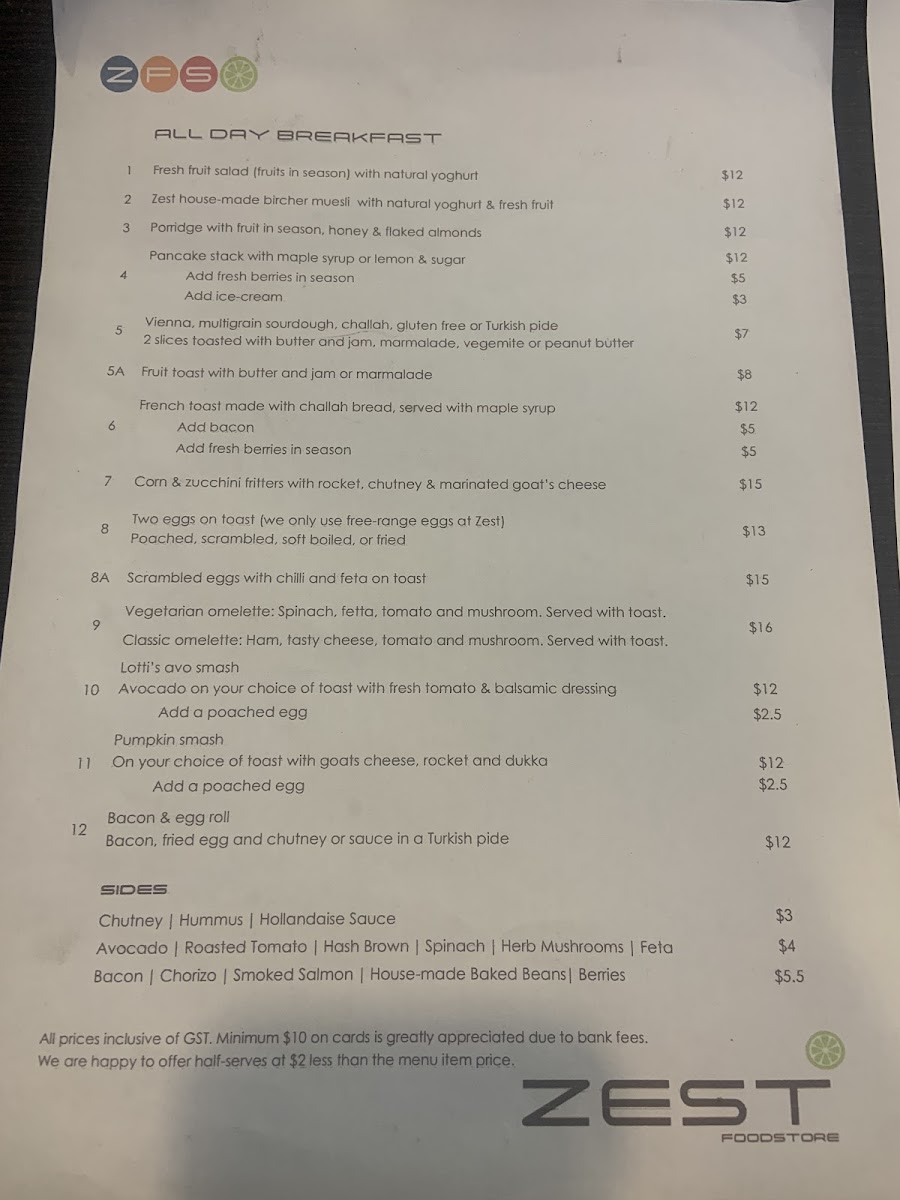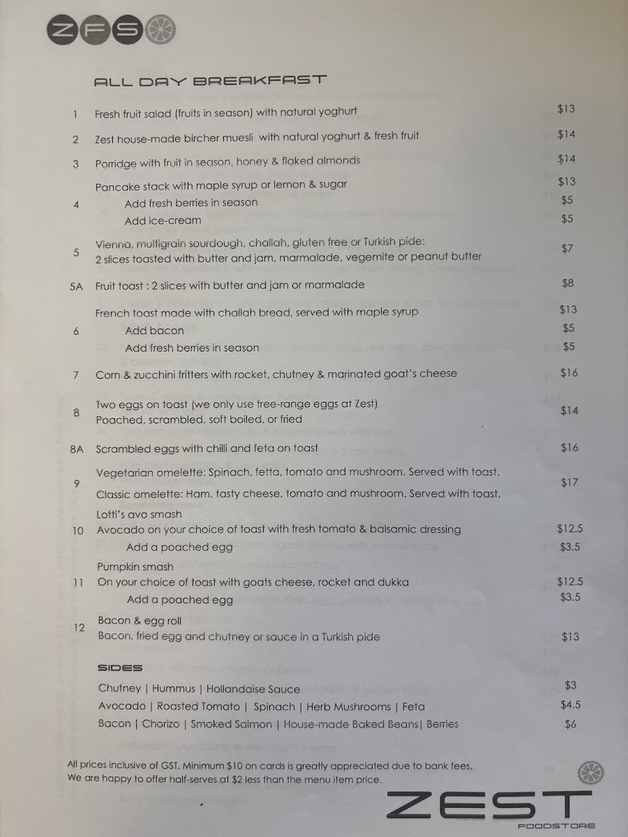 Two eggs on toast (we only use free-range eggs at Zest). Poached, scrambled, soft-bolied or fried.