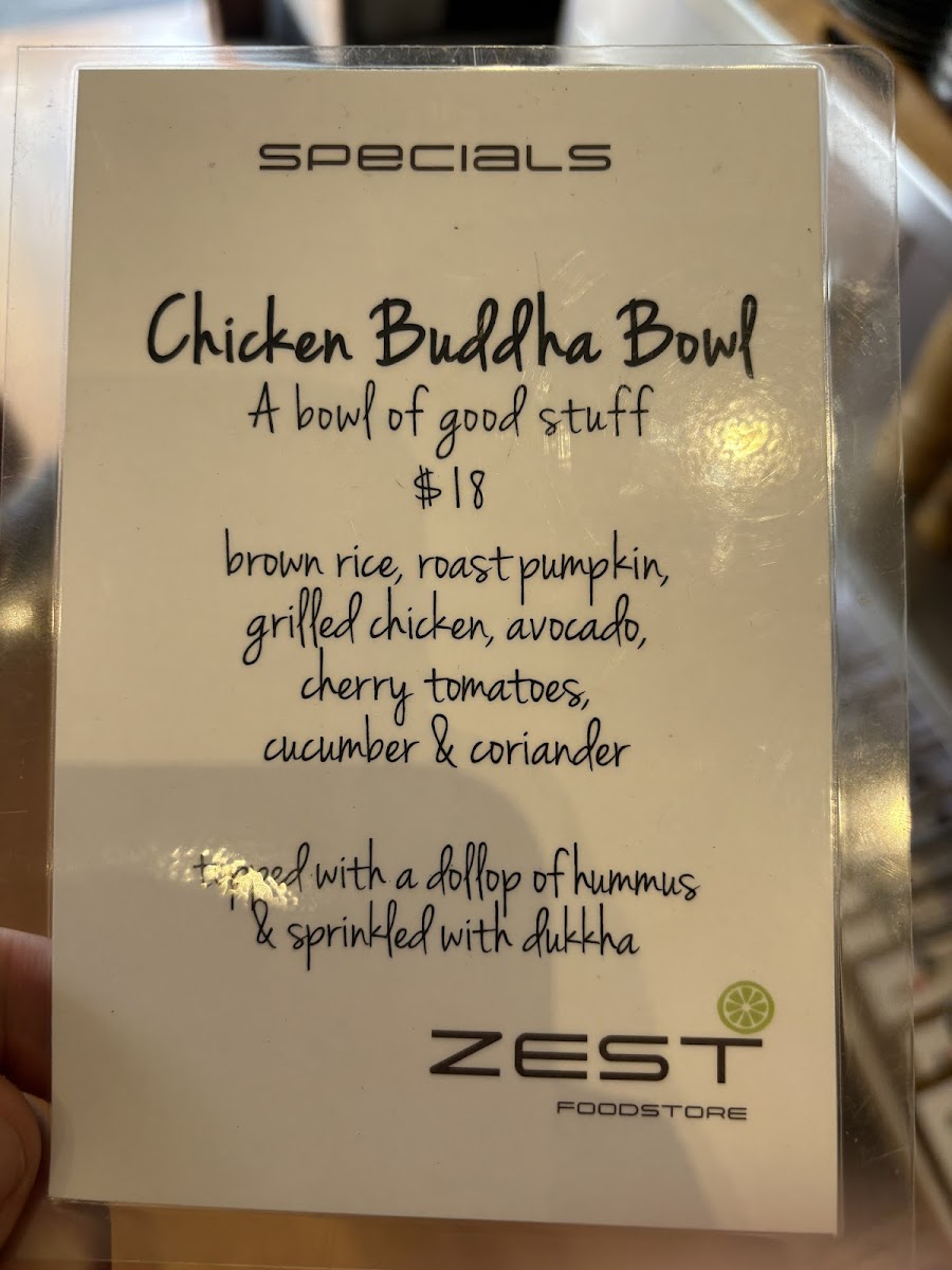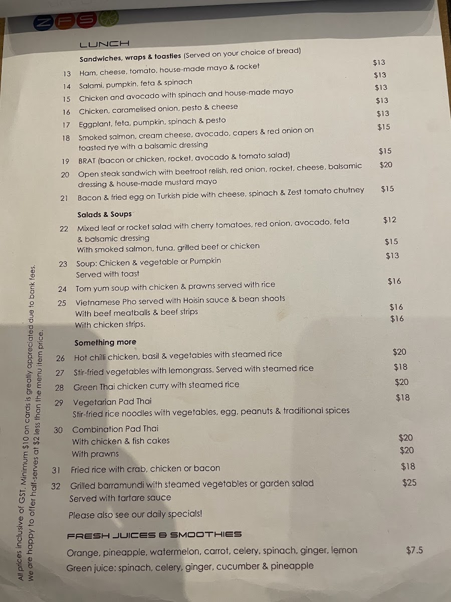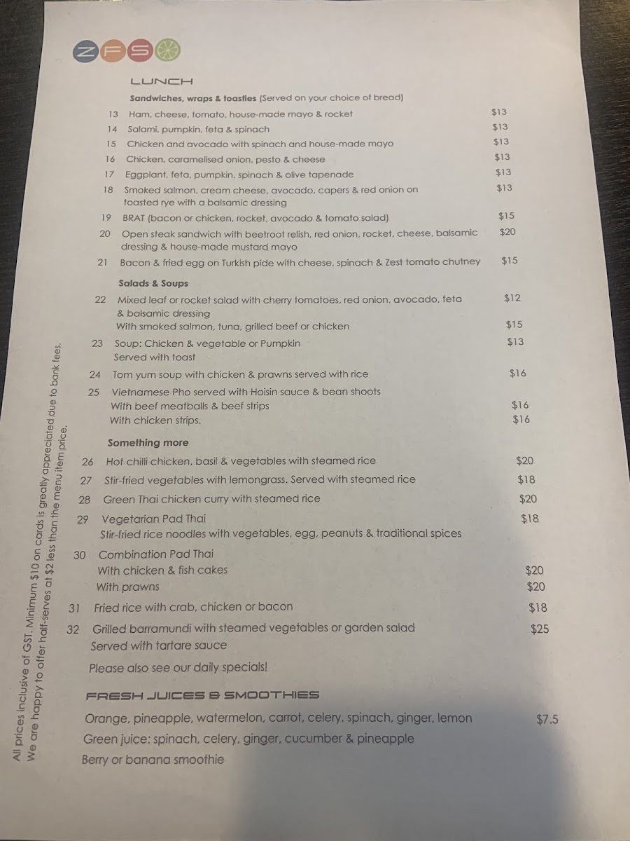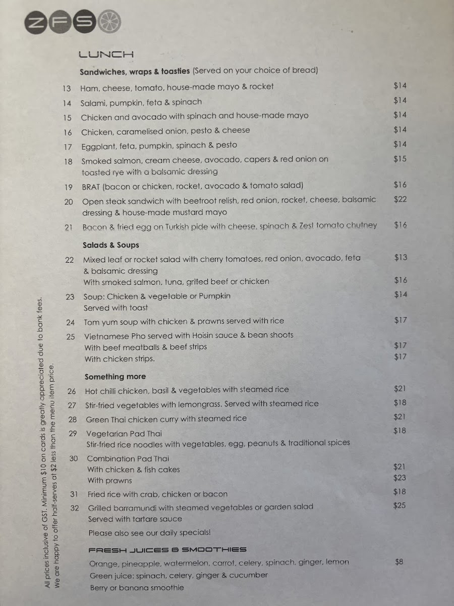 The menu at Zest In Food in Brighton East offers a delightful variety of options, perfect for any time of the day. For breakfast, you can enjoy a refreshing Fresh Fruit Salad, hearty Zest House-Made Bircher Muesli, or warm Porridge Pancake Stack. If you're in the mood for something light, choose a simple Toast to start your day. To complement these dishes, there are a range of tasty sides, including Chutney, Hummus, and Hollandaise Sauce, along with Avocado, Roasted Tomato, Spinach, and even Bacon or Chorizo. For lunch, you can indulge in a variety of sandwiches, wraps, and toasties, such as the delicious Ham, Cheese, Tomato, House-Made Mayonnaise & Rocket, or the Chicken & Avocado with Spinach & House-Made Mayonnaise. The Eggplant, Feta, Pumpkin, Spinach & Pesto is another standout, catering to vegetarian tastes. Salads and soups also feature on the menu, with options like the fresh Mixed Leaf or Rocket Salad or the flavorful Vietnamese Phở. If you're craving something more substantial, the Hot Chilli Chicken or Green Thai Chicken Curry will certainly satisfy your appetite. Lastly, the restaurant's fresh juices and smoothies, including Orange, Carrot, Green Juice, and Berry or Banana Smoothie, provide a refreshing drink to accompany your meal. The variety and quality of dishes at Zest In Food ensure there's something for everyone, making it a must-visit for any food lover in the area.